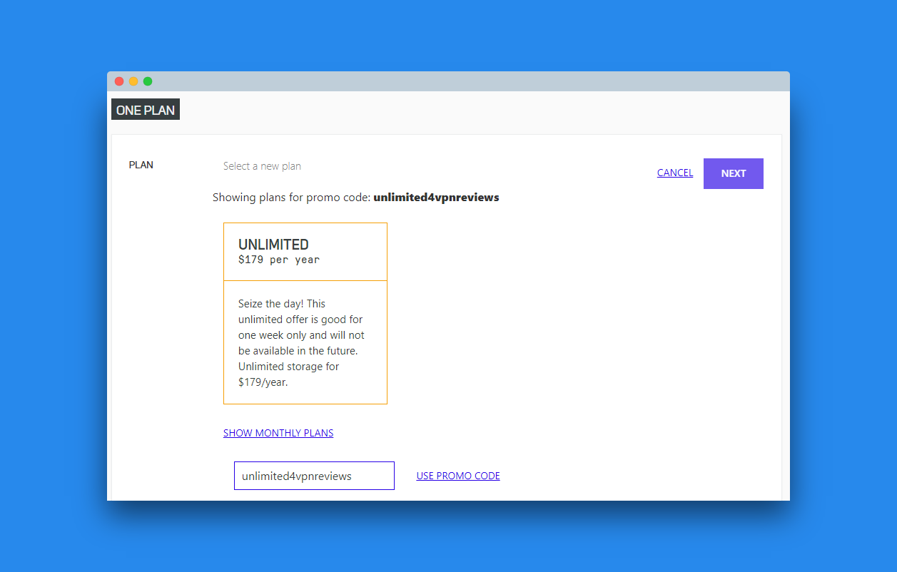 The promo code to enter on your account page to upgrade to Unlimited is: unlimited4vpnreviews.