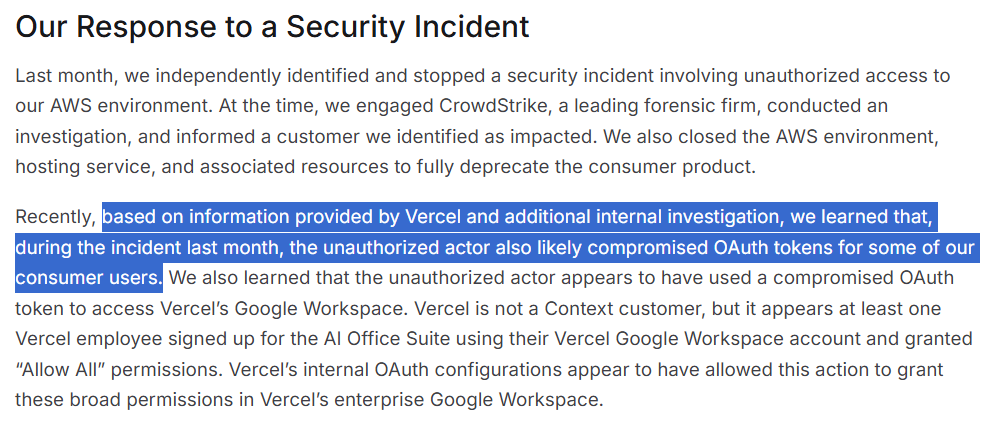 The problem with that account is what Vercel's disclosure forced Context.ai to admit on 19 April: the March incident had also exposed OAuth tokens belonging to some of its consumer users, and Context.ai only learnt this when Vercel told them. The emphasis in their bulletin is on Vercel's "internal OAuth configurations" having allowed the broad Allow All grant in the first place, which is technically fair and rhetorically pointed. Context.ai is a company whose product generates permission requests for a living, and one of the organisations it asked for Allow All permissions was the one that ended up explaining to Context.ai how badly they had been breached.