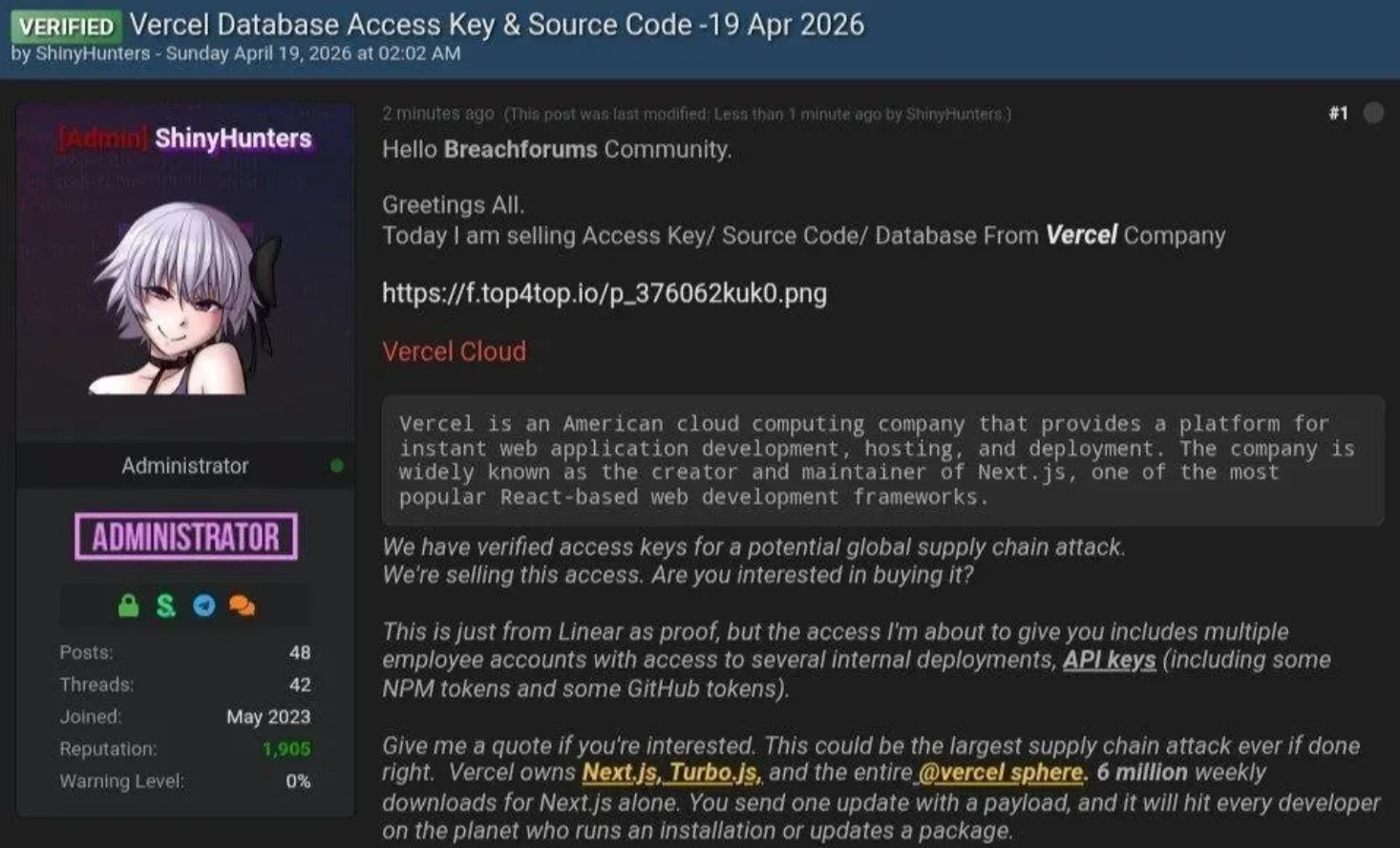 The ShinyHunters post on BreachForums belongs in the same bucket of noise. BleepingComputer reporting has actors linked to recent genuine ShinyHunters incidents denying involvement, and the original ShinyHunters operation has been the subject of enough arrests over the last eighteen months that the brand is largely a flag of convenience for impersonators. There may well be stolen data for sale. The attribution claim should not be believed.