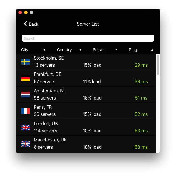 Selecting a server is basically the same experience as on Windows: the list is sortable by country, ping or server load.