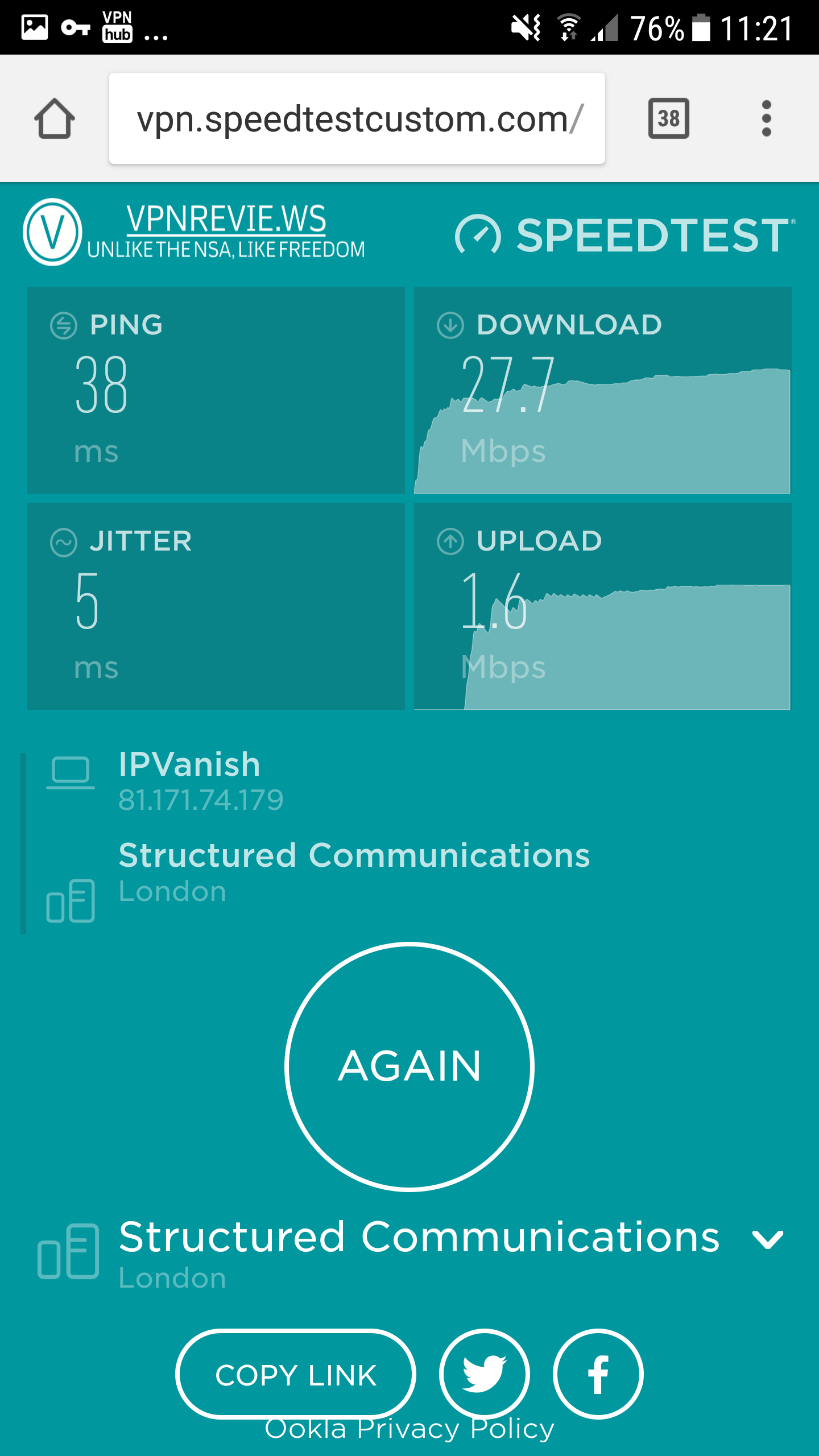 Testing with the mobile network is even worse, as the ping dramatically increases. VPNhub doesn't handle disconnects gracefully, and seems to simply crash when the network connection is lost.