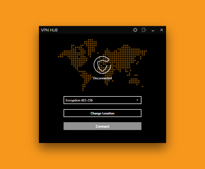 The main screen of VPNHub for Windows is very minimal: it is only composed of a worldmap graphic, a dropdown to select whether you wish to use AES-256 or AES-128 encryption, a button to "change location" and a connect button.