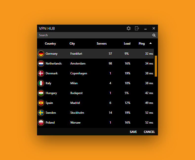 While the ping is displayed for each location, it is disappointing not to find a "fastest server" option to automatically select the server with the lowest ping value. Double-clicking on a location doesn't do anything, as you have to select the Save button which is just besides the cancel one. The lack of difference between the two button is bad UX, as it makes the user prone to misclicks.